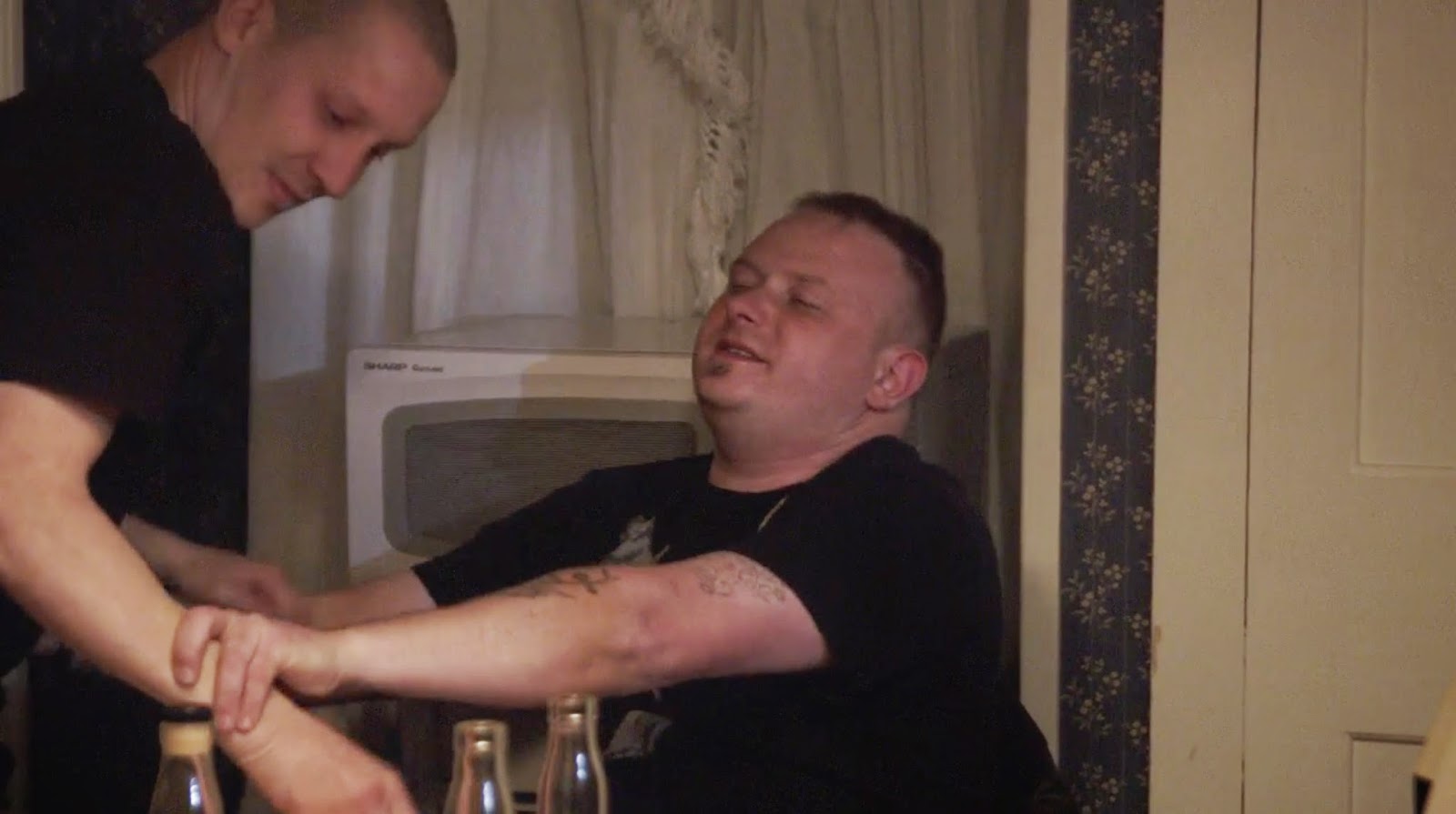— Hitchcockian signs make their return in Adieu au langage: a bathtub spattered with blood; a knife, this time inside a sink; windshield wipers in motion beneath the rain like on the windshield of Janet Leigh’s car on the way to the Bates Motel... A reply given by the man to the woman mentioning a stabbing four years prior suggests a possible link between these elements. On the film’s soundtrack, shrill violins from Giya Kancheli’s Abii ne viderem curiously recall Bernard Herrmann’s famous score for Psycho.