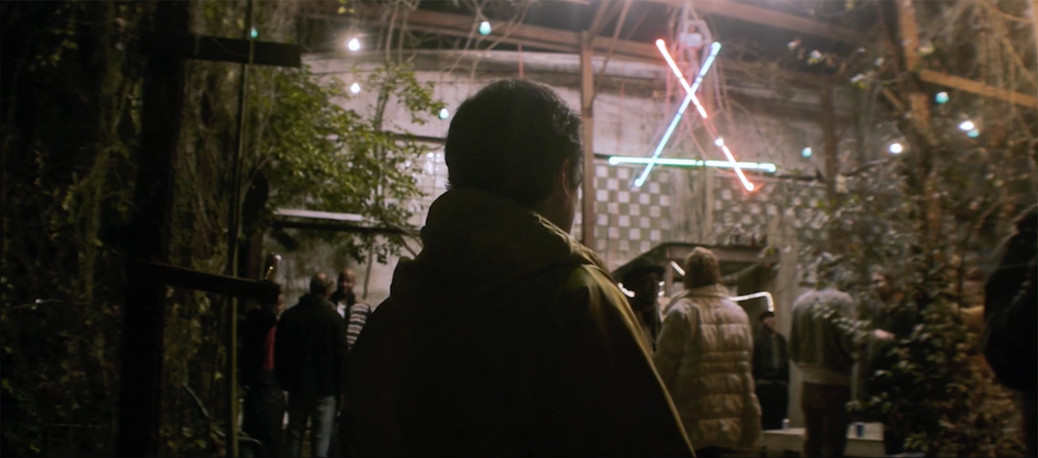 The 'sketch'-est of the four stories, Yazoo Women involves three guys transporting a John Deere riding mower back to its owner from the yard where it underwent repair. They set out in daylight and arrive in the evening at the owner's house only to find the scene is a gals-only happy-divorce party. The host invites the guys inside, and a one-sided-awkward collision takes place between the three blue-collar/odd-job Gen-Y'ers-or-Millennials and the done-up blouse enthusiasts who gyrate beneath the pulsing party bulbs. A 180-degree pan reveals the yardbirds as wallflowers, before a few of the revelers coax them to engage, the music transforming from uptempo kitsch to a late-night soul-jam. Unforeseen couples embrace swaying in languid slow pans across turning torsos and chins nestled in shadows between heads and shoulders. The fluidity of the camerawork (operated by Azod Abedikichi and Robby Piantanida, who plays one of the guys alongside Arrmon Abedikichi and Dau Mabil) and sound-design (Chase Everett) sets a precedent for the other three stories: voice-over and sounds that lap over cuts (which at times can also, conversely, be dry, abrupt, and ironic), music tracks that mix one-into-the-other, ambient aural interludes between the sequences; most of the 'stories' can be apprehended with eyes closed, like radio- or podcast-plays à la Joe Frank...